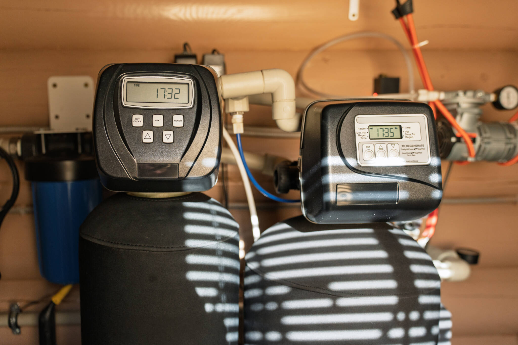 Modern Water Filtration And Heating System Installed In A Utility Room, Featuring Digital Control Panels And Various Tanks And Pipes Under Warm Indoor Lighting.