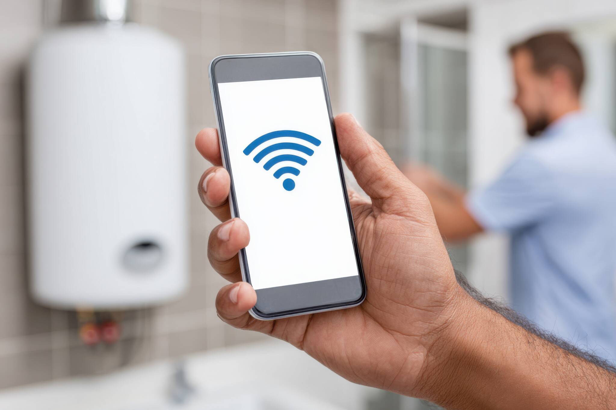 Hand Holding Phone Displaying Wifi Symbol, Man In Background, Bathroom Setting With Water Heater Visible.