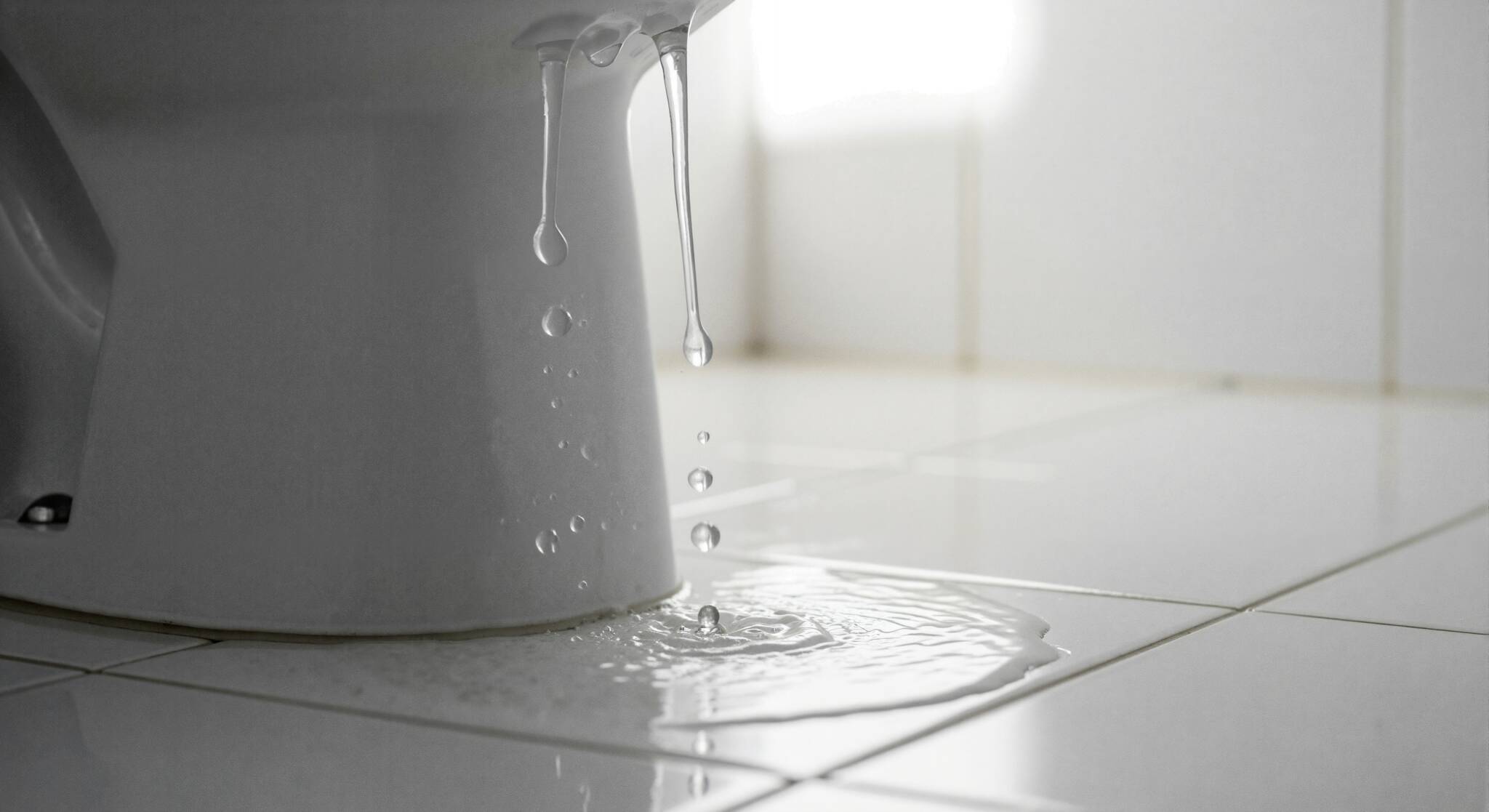 A leaking white toilet with water dripping onto the tiled floor. Close-up of a plumbing problem. Household water damage and repair concept.